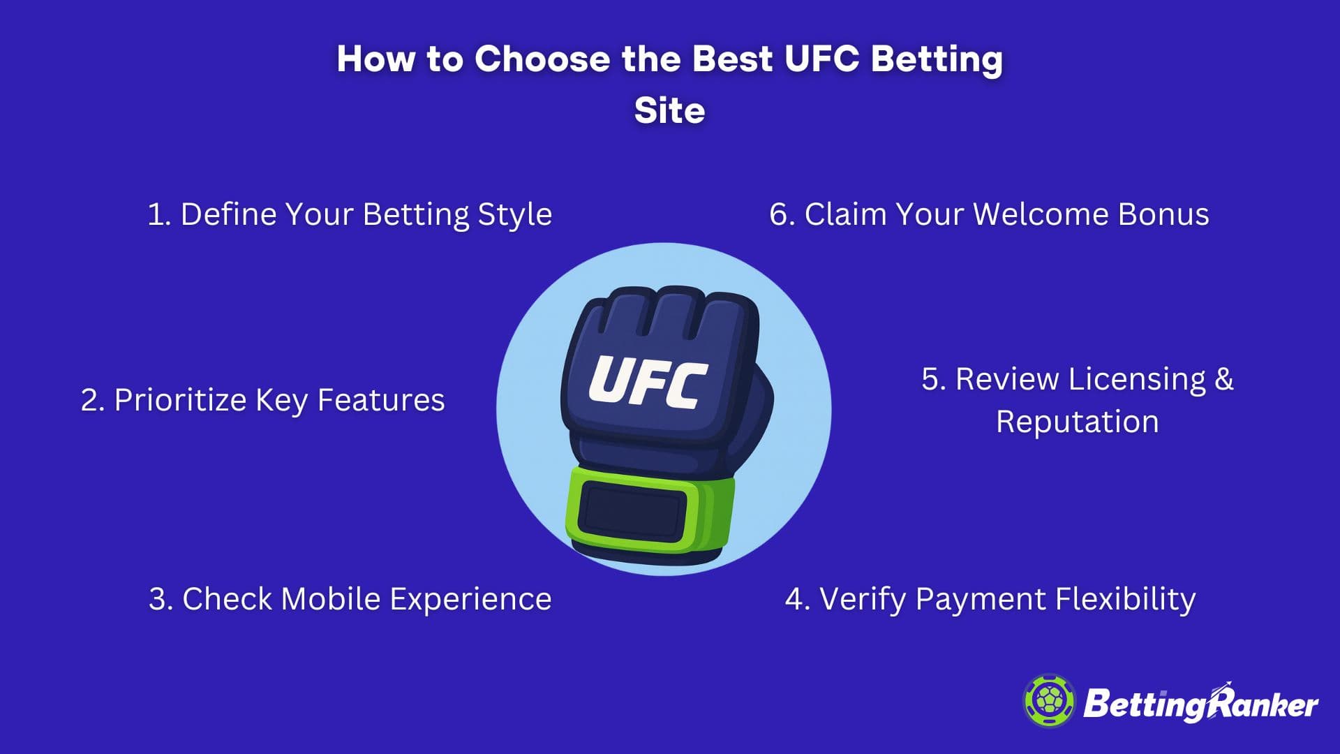 Ingen enskild UFC-betting-sajt passar alla. Det bĂ€sta spelbolaget för dig beror pĂ„ hur du bettar, vilka funktioner du vĂ€rdesĂ€tter och hur djupt du vill gĂ„ in i UFC-marknaderna. HĂ€r Ă€r en snabb 6-stegsguide som hjĂ€lper dig att matcha din bettingstil med rĂ€tt plattform â med endast betrodda spelbolag som finns pĂ„ BettingRanker.