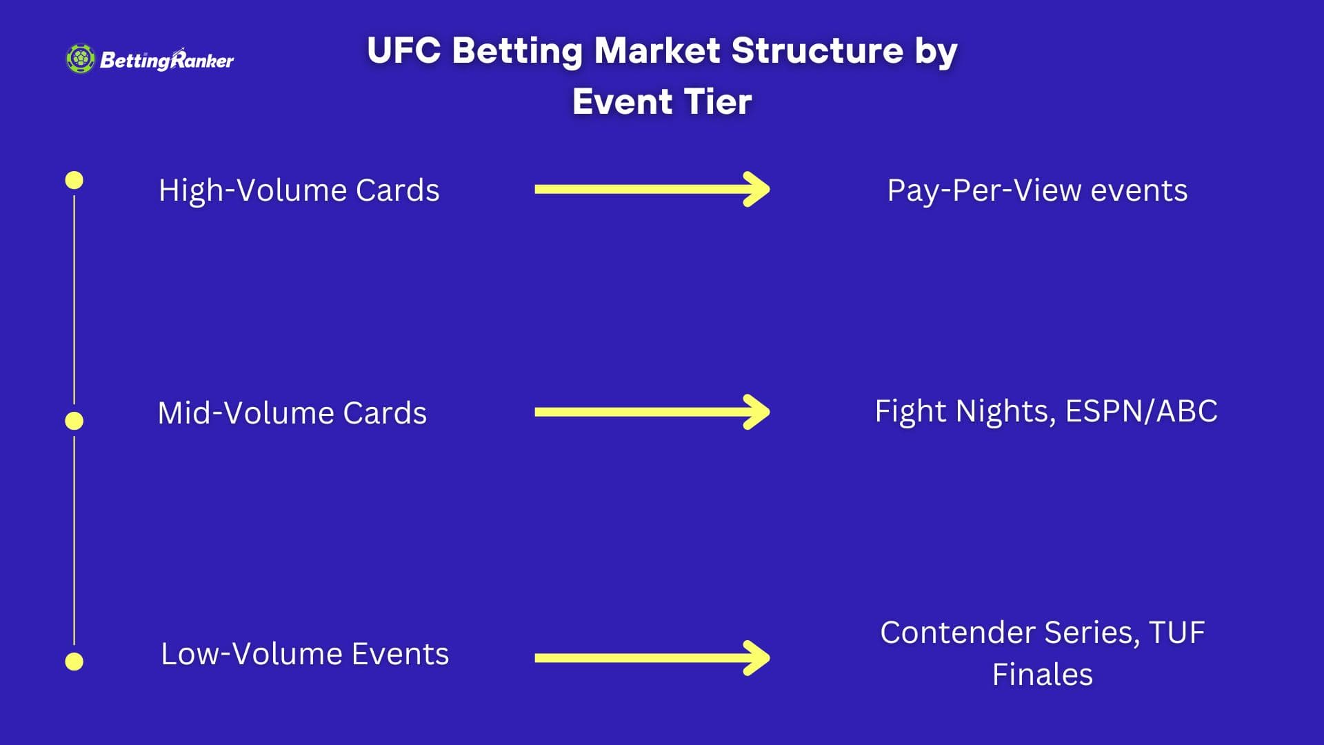 Att förstĂ„ UFC-bettingmarknaden innebĂ€r att veta hur den beter sig baserat pĂ„ evenemangsnivĂ„n. En titelmatch pĂ„ ett blockbustert Pay-Per-View (PPV) attraherar inte samma typ av bettingvolym â eller bettingmöjlighet â som en tyst co-main event pĂ„ ett Fight Night-kort. Marknaderna skiftar inte bara efter fighter-skicklighet, utan ocksĂ„ efter kortets synlighet, likviditet och timing.
